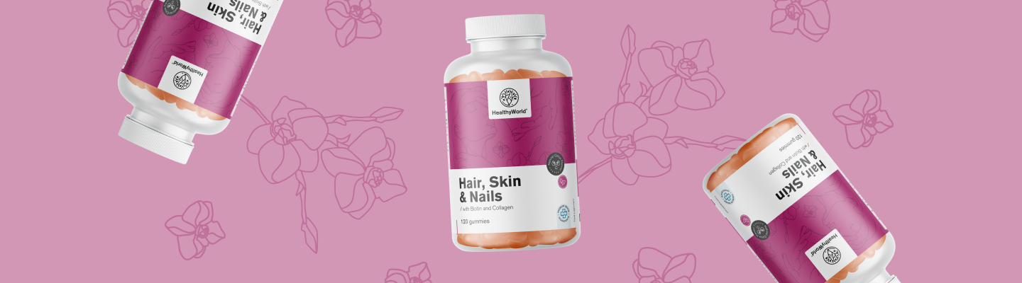 Hair, Skin & Nailsgumíky, ktoré obsahujú 3 vitamíny a kolagén, ktoré optimálne zabezpečujú vlasy, pokožku a nechty a zároveň:
