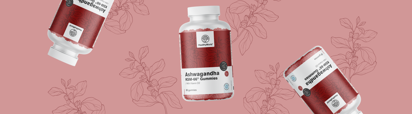 Zloženie: glukózový sirup, cukor, voda, suchý extrakt koreňov ashwagandhy KSM-66® (Withania somnifera (L.) Dunal), želírujúca látka: pektín, regulátor kyslosti: kyselina citrónová, regulátor kyslosti: mliečna kyselina, prírodné arómy, regulátor kyslosti: sodný citrát, farbivo: koncentrát z repy, ergokalciferol (vitamín D2), rastlinný (palmový) olej, poťah: karnaubský vosk.